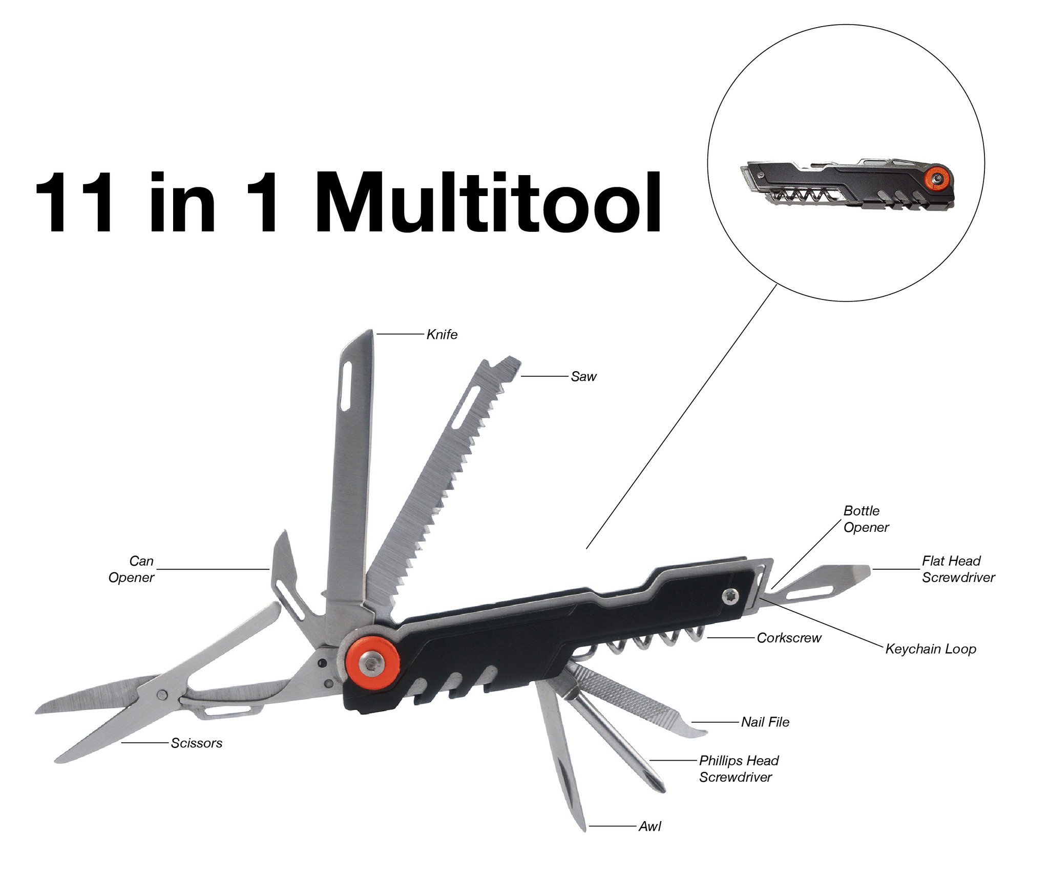 11-IN-1 MULTI-TOOL – Includes a knife, saw, bottle opener, can opener, flathead screwdriver, Phillips screwdriver, scissors, corkscrew, nail file, small pick, and thread loop.