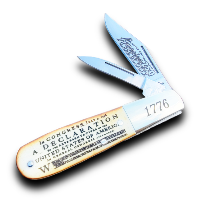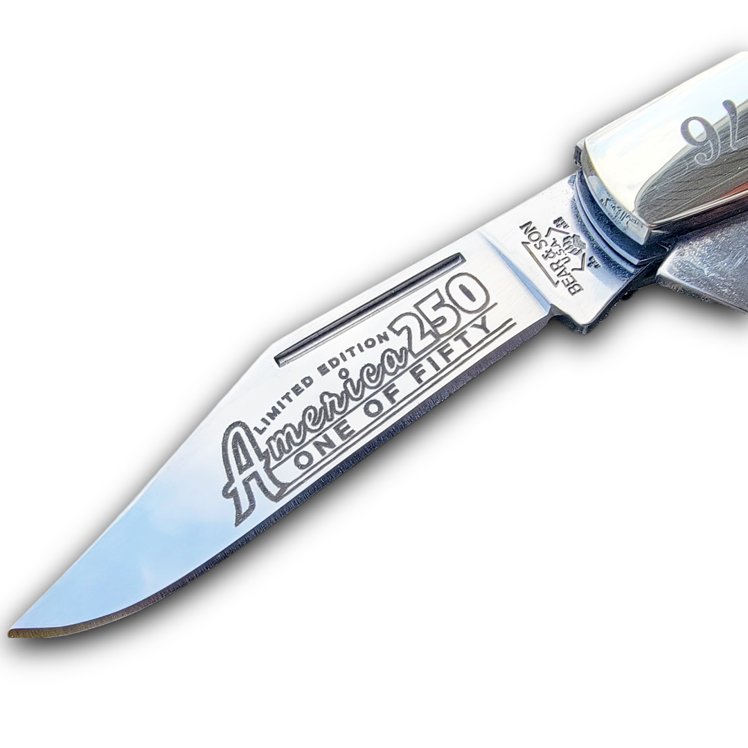 With 2026 marking the 250th anniversary of America Red Hill Cutlery collaborated with Bear and Son Cutlery to create a limited-edition series of American made Barlows to commemorate the Semiquincentennial. Each Torched Natural Bone Barlow in the series will feature patriotic artwork on handles that represent the history of the USA. The nickel silver bolsters will feature 1776 the year of our countries founding, and the main blades will have America 250 artwork as well as Limited Edition “One of Fifty”. There will be Six individual knives to complete the anniversary set. These are exclusive to Red Hill Cutlery and only available in limited supply. All Six knives in set Sold Separately.