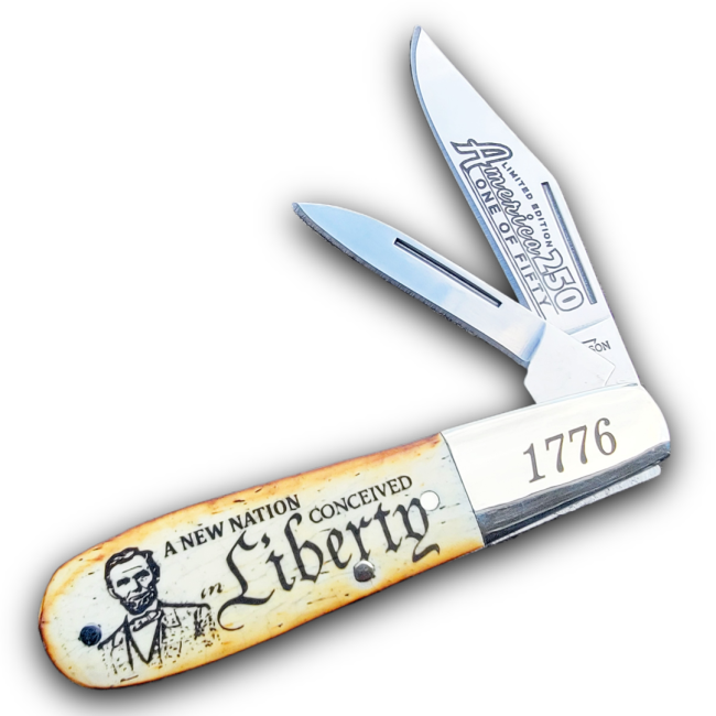 1 of 6 Exclusive Designs commemorating the 250th Anniversary of America. Each Torched Natural Bone Barlow will feature a historic image representing the great history of the USA. Each Barlow will be marked on bolster with 1776, and each blade will feature America 250 artwork with “1 of 50”