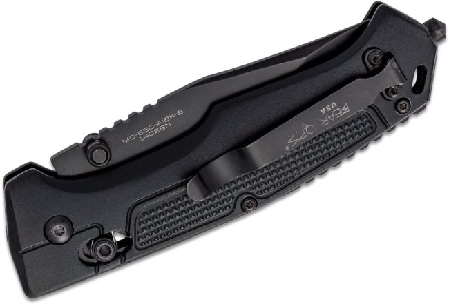 The Rancor IV folding knife is a midsize flipper with quick action and a no-nonsense style. The 3.25″ clip point blade rides easily on ball bearings and deploys quickly with the integrated thumb studs. The black aluminum handles are contoured to fit the hand and are lightweight to reduce the strain in using the knife. Each knife comes with a stainless steel pocket clip and makes a great choice for your EDC.