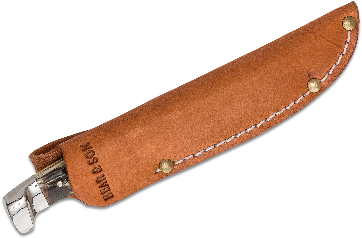 The Bear & Son India Stag fin knife is a great aide in any hunting excursion. Sturdy yet lightweight, this fixed blade weighs 2.8 ounces out of the sheath. The 3.15″ clip point blade is quick and precise to use and makes a great choice for small outdoor tasks. The stag handles give off a natural feel and are accentuated by the beautiful nickel silver bolsters. The India Stag Fin Knife comes with a genuine leather sheath with a belt loop for easy carrying.