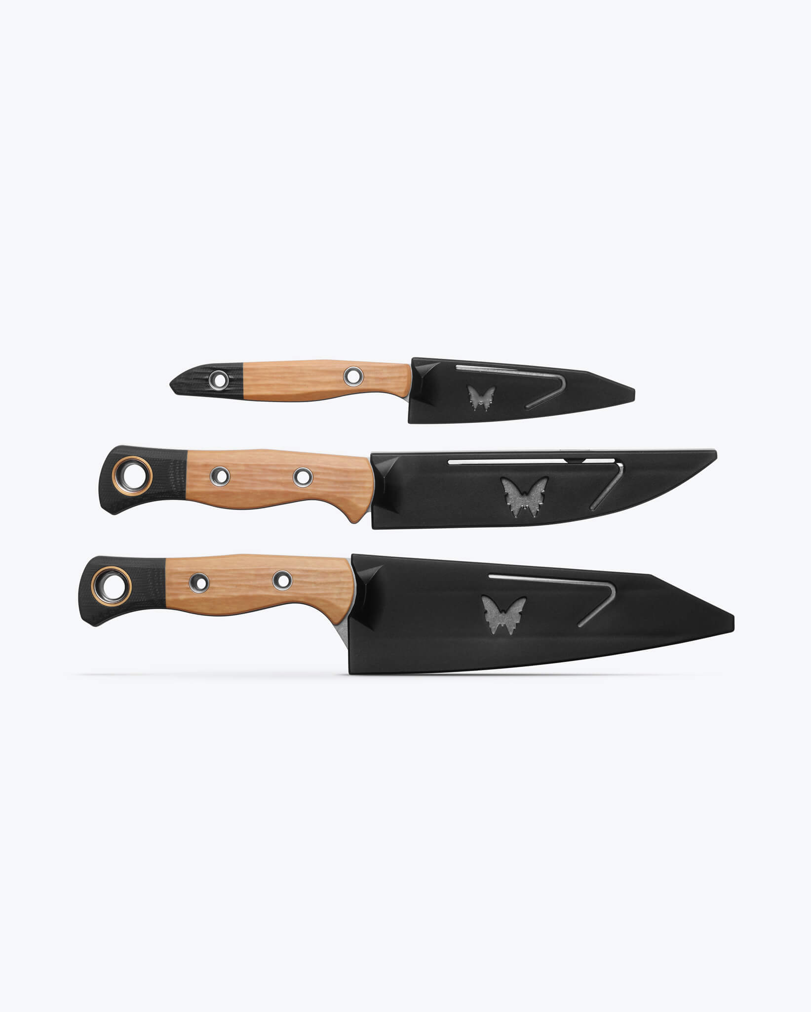 Everything you need. More than you imagined. Benchmade’s most capable culinary trio comes together in our reimagined 3 Piece Set, designed to slice, prep, trim, and serve with precision. Featuring the all-new Wildcoast™ multipurpose utility knife, the new True Paring Knife, and the proven Meatcrafter® hybrid meat processing knife, each blade is crafted from CPM-154 stainless steel with a satin finish, with edge performance enhanced by SelectEdge®. Warm Maple Valley Richlite handle scales with black G10 bolsters offer comfort and control with elevated visual appeal. Accompanied by protective blade covers, take command of the countertop with the new 3 Piece Set.