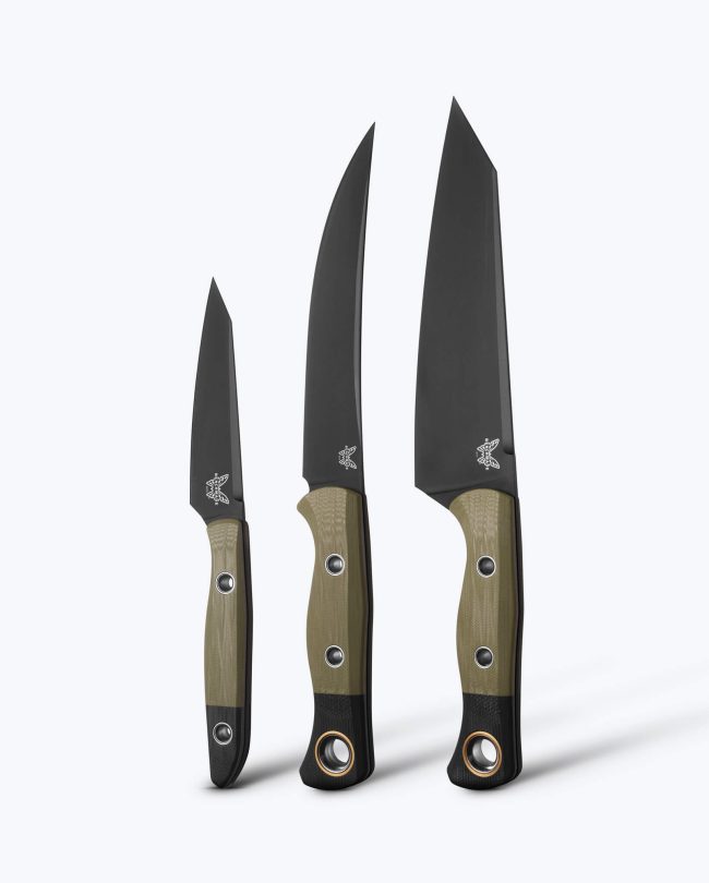 Everything you need. More than you imagined. Benchmade’s most capable culinary trio comes together in our reimagined 3 Piece Set, designed to slice, prep, trim, and serve with precision. Featuring the all-new Wildcoast™ multipurpose utility knife, the new True Paring Knife, and the proven Meatcrafter® hybrid meat processing knife, each blade is crafted from CPM-154 stainless steel in a black DLC finish, with edge performance enhanced by SelectEdge®. Durable OD Green G10 handle scales with black G10 bolsters deliver a confident grip in any setting. Accompanied by protective blade covers, take command of the countertop with the new 3 Piece Set.