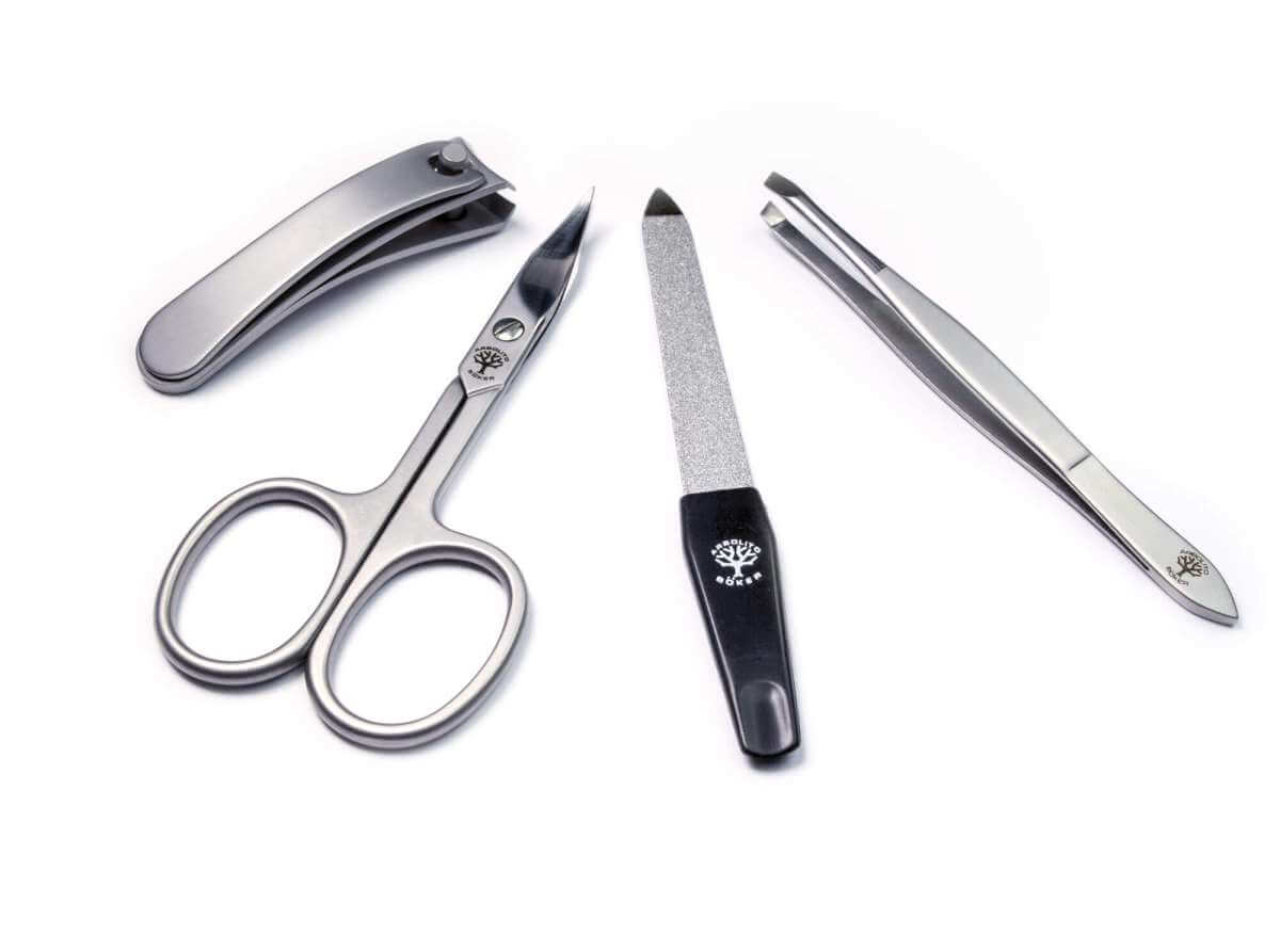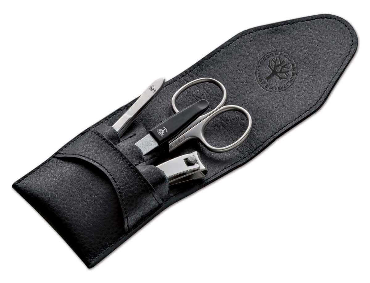 The modern man values a neat appearance. That includes having a regular manicure, which can only be achieved using first class instruments. The latest manicure sets by Boker Arbolito address these needs. The cases are made of premium cowhide leather, providing long-lasting protection for the quality tools, even when subject to the wear and tear of continuous travel. All manicure instruments are made of stainless steel with a fine matt surface finish. Four piece set with nail scissors, nail clippers, tweezers and nail file.