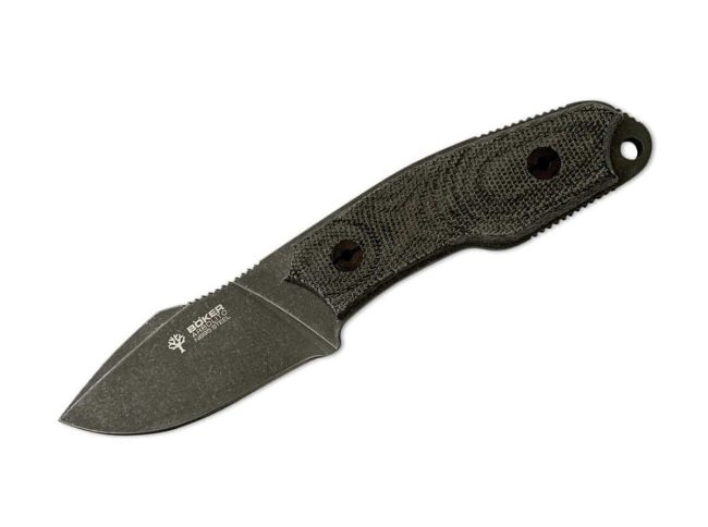 The Boker Arbolito El Héroe is a reliable and highly capable companion for the jungle of day-to-day life, based on the design of the Hungarian knife maker, Péter Farkas. The heavy blade is made from Böhler N695 steel, and is equipped with a pronounced choil and a large, riffled thumb ramp for perfect control. The full tang design fully extends the 4 mm material thickness through the grip, giving the knife impressive strength. The recessed grip and appropriately placed riffling ensures optimum handling. The Mircata design made by the exceedingly popular El Héroe comes with black Mircata grip scales with red fiber layer and an enduring stonewashed finish. Black leather sheath for carrying horizontally.