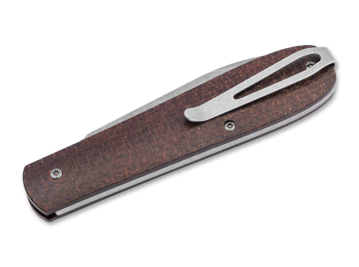 The convertible stainless-steel clip (tip-up/r) contributes to the discretion as a self-evident virtue, which allows for deep carrying and makes the knife disappear almost completely in one’s trouser pocket. The Boker Coffin Jute Micarta is supplied with a high-quality felt case. Handmade in the Boker Manufactory in Solingen.
