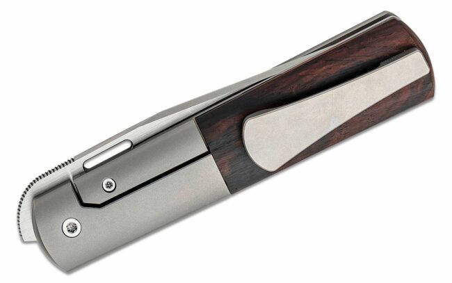 Brad Zinker’s avant-garde interpretation of the successful Boker Barlow is peppered with some modern elements without losing sight of the roots of the classic original. Characteristic is the extra-long bolster, which is made of titanium in the Boker Plus by Reate Knives Urban Barlow MCF and integrates a modern integral frame lock as a locking mechanism. The frame lock has a stainless-steel inlay and an overtravel stop so that the blade locks securely and without wear. The handle scales are made of exquisite Cocobolo wood and set a classic accent. As an alternative to the front flipper, the ball-bearing and hollow-ground drop point blade made of M390 has a hole for opening the pocket-knife that is reminiscent of the nail nick of the original model. The wide titanium clip is milled from the solid and allows for a comfortable carrying method (tip-up/r). Supplied with a high-quality nylon pouch.