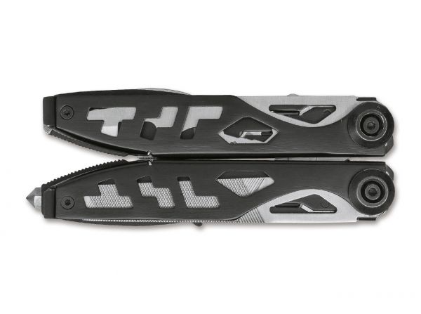 The pliers of the Boker Plus Specialist II offers a reinforced wire cutter and is a true all-rounder. They have the flat gripping surface of long-nosed pliers and a so-called burner hole for gripping external hex screws, cap nuts, and pipes. The four main tools are secured with a liner lock, which makes them suitable even for heavy-duty tasks. They include a partially serrated blade, a wood saw, a file with a ruler and a multitool featuring a can opener, bottle opener, wire bender/stripper, and an Allen key. The added belt cutter can be opened with a nail nick. The flat handle scales have decorative cut-outs and consist of stainless steel. Two double-sided bits, a matching chuck, and a practical glass breaker complete the equipment. The Specialist II comes with a high-quality nylon belt holster.