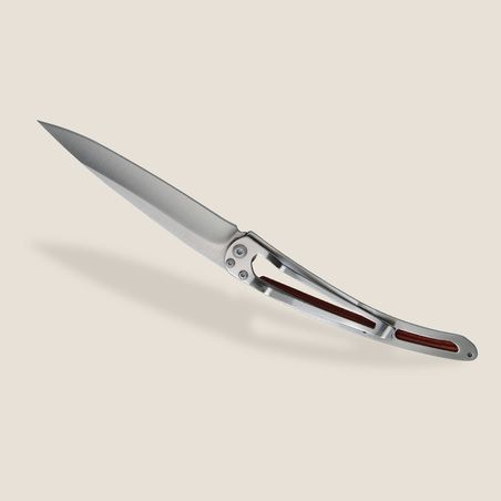 The Tattoo series features an ultra-light, ultra-flat, Z40C13 stainless steel blade with titanium finish. This Deejo knife is decorated with a handle plate in solid coral wood (or padauk). This species of wood has long been used in cutlery for its exquisite red/amber reflections (hence its name), robustness and excellent resistence to humidity. Here it wonderfully underscores the elegance of a Deejo knife.
