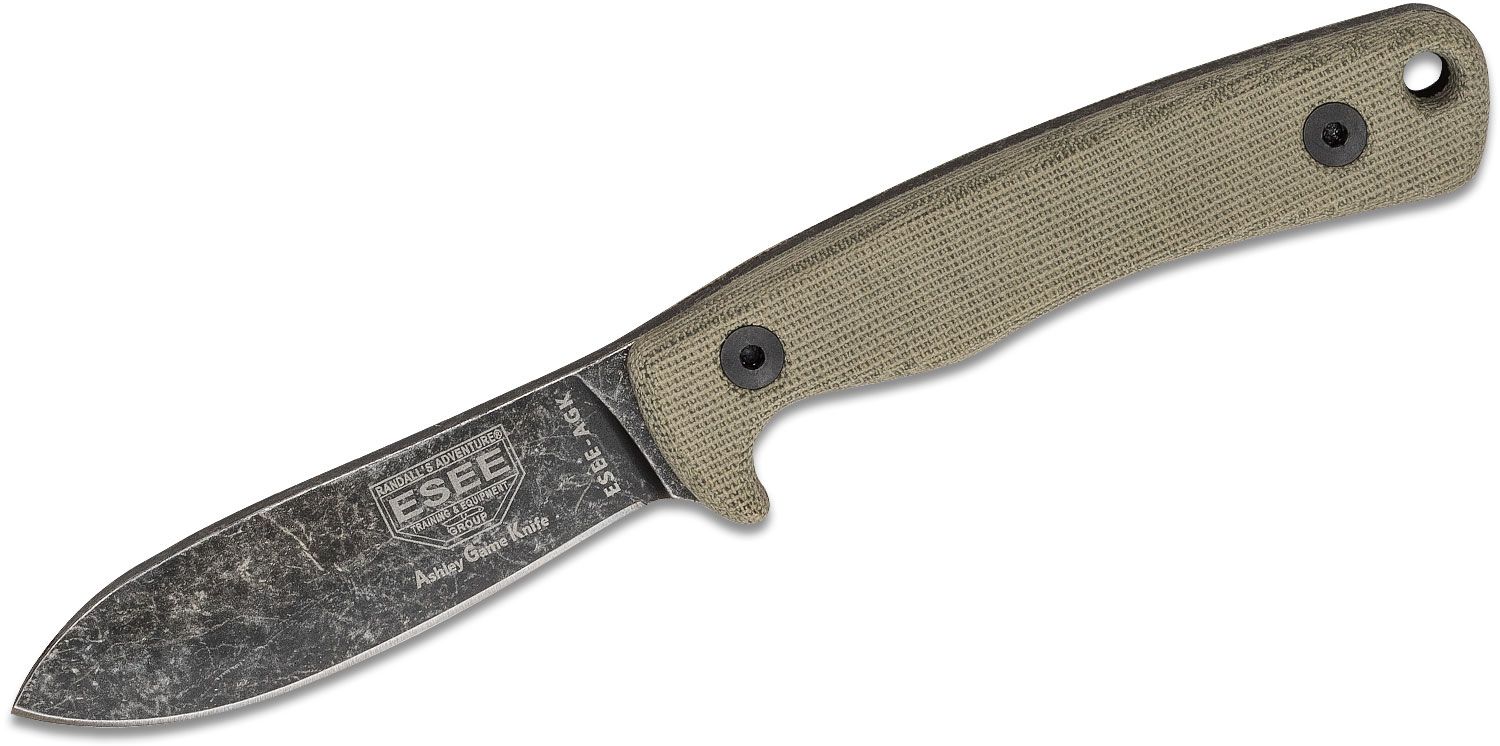 When ESEE finally decided to make knives specifically for hunters, they sought advice and opinions from some of the best in the industry, and the Ashley Game Knife (AGK) was designed by Ashley Emerson. As a guide and hunter from Alaska to Africa, Ashley has had opportunities to deal with hundreds of deer, many more wild hogs, and other animals from squirrels to buffalo. As he has with guns, he’s used many different knives and modified them to fit what works, and the AGK was born from his vast experience handling game in the field. The lengths of both the blade and the handle have been optimized for leverage for tough jobs such as splitting a sternum. The handle incorporates a guard, a proven grip shape, and a radiused lanyard hole large enough for a loop of 550 cord. The scales are made of canvas Micarta, which is a solid handle material that doesn’t slip when wet. Ashley has used a wide variety of scale materials, and he prefers Micarta for working knives as the grip and feel is way more important when working game than the scales being impervious to sweat, blood, and other fluids. Like the stonewashed black-oxide blade, the scales develop a great “worn-in” look with use. The blade width allows for working inside the pelvic cavity of the average whitetail, and the subtle sweep of the blade places the point in line with the handle. This still allows an optimal drop point and a continually curved edge, along with the strength of a full tang blade. With no sharpening notch at the choil, you won’t have to worry about the knife catching on hides.