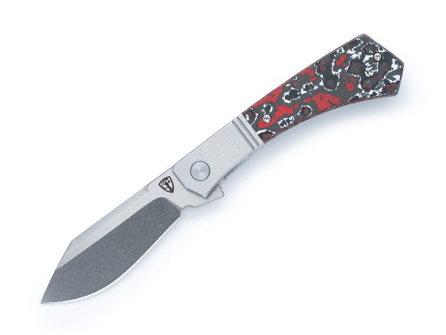 Featuring Fat Carbon Snow Fire scales in dark gray, white, and red, this Stray Dog has a bold, high-contrast look. A satin finished bolster adds refinement, while the N690 blade with satin/stone washed finishes balances toughness with style.