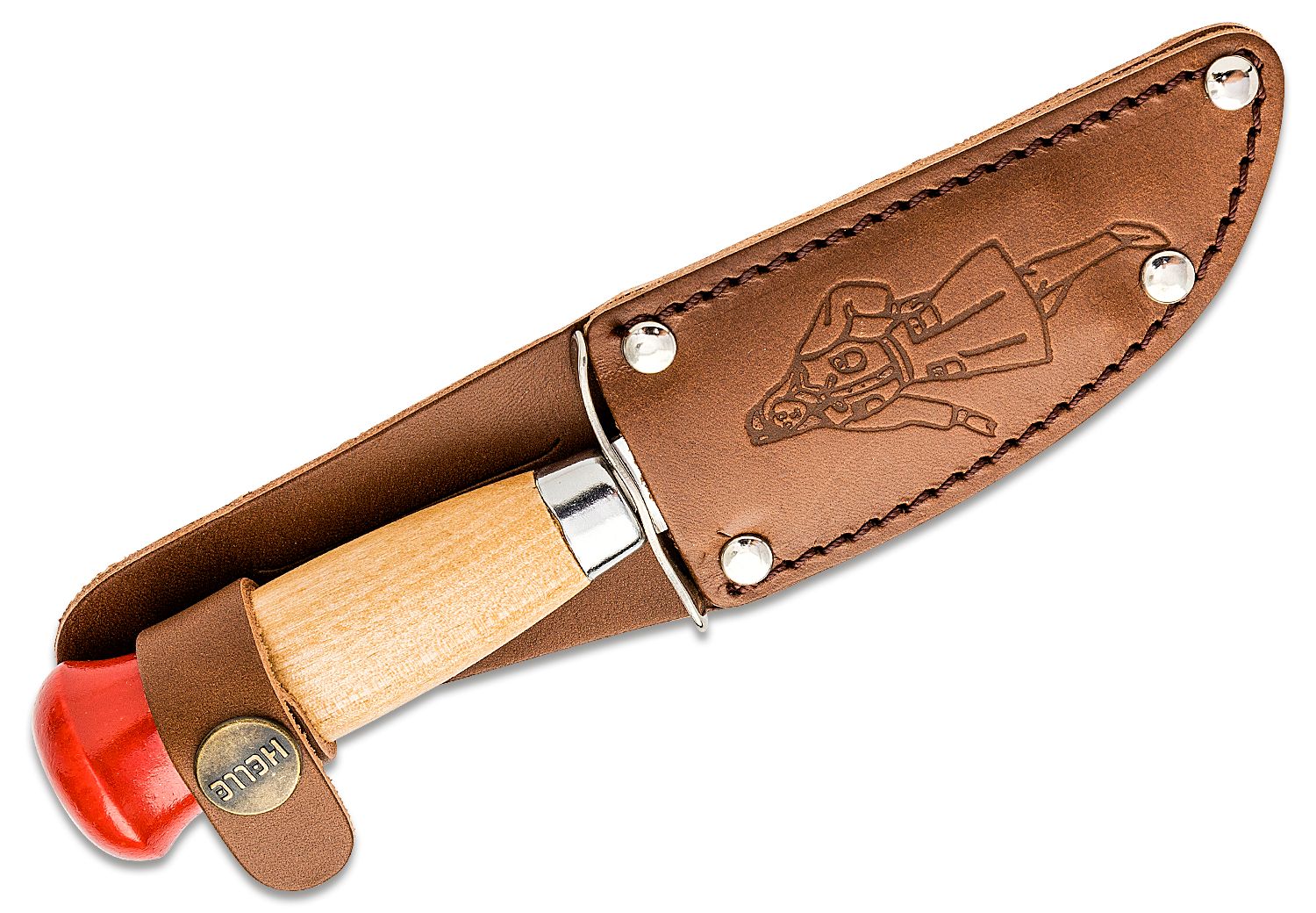 Helle Speiderkniven Girl Scout. 7-1/8″ overall. 3-1/2″ Sandvik 12C27 stainless blade. Birch handle with steel guard. Genuine leather belt sheath embossed with image of girl scout. Made in Norway.