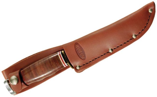 Classically styled leather-handled hunting knives have been popular since the early 1900s. Dressy enough for gift giving and practical for field use. Features a brass guard and aluminum butt cap. Plastic lined leather KA-BAR® sheath included.