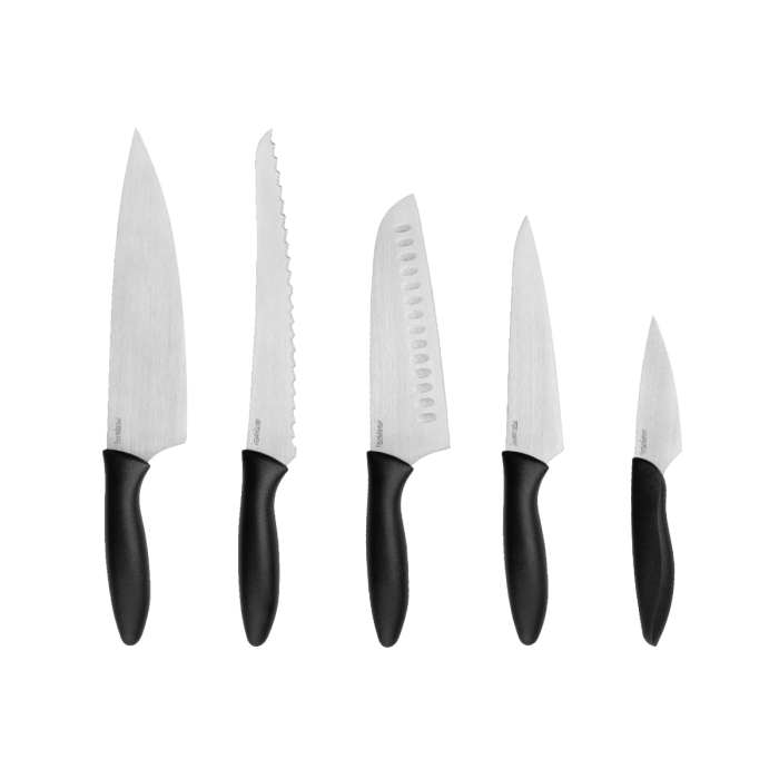 Level up your kitchen with the Kershaw Kitchen Block Set. This package includes five Kershaw kitchen knives, each with a unique blade shape ready to prep your next meal. The wood block features a stylish black coating that matches the comfortable knife handles. It also includes an extra slot for Taskmaster Shears (sold separately). From an all-purpose chef’s knife to a small paring knife, and everything in-between, this set is the perfect entry point for any home chef.