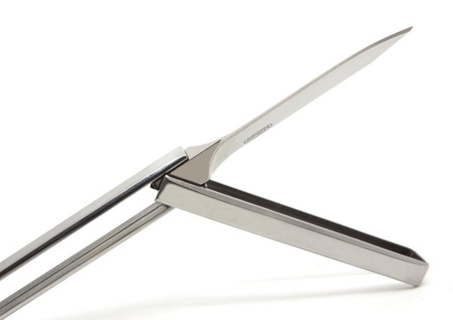 At first sight the unique design solution of the knife looks like an interesting brain teaser. Double flipping the stainless steel handles by 180° opens the knife. The pointed tip blade can be closed in the opposite way. All handle corners are bevelled for a better ergonomics and comfortable holding the knife.