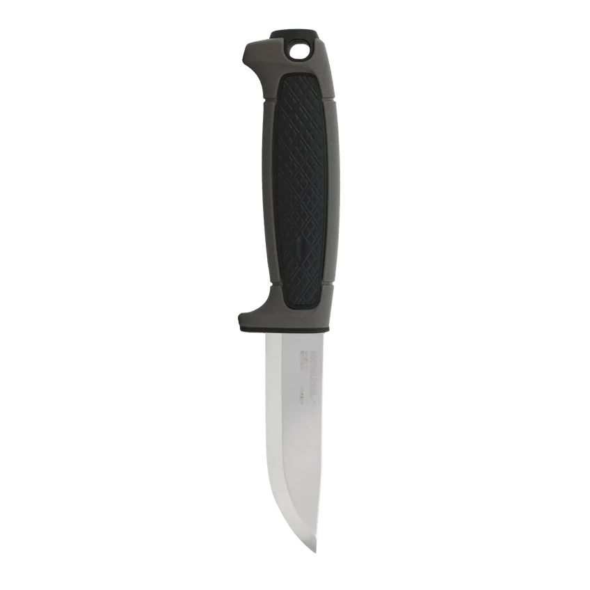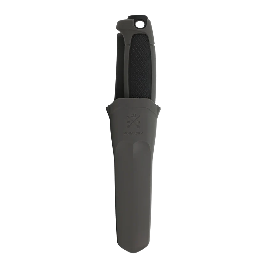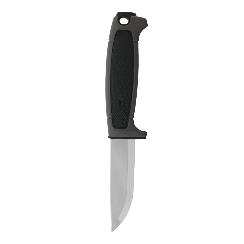 The ergonomic handle is made entirely from durable polymer (PP) that withstands moisture, dirt, and cold. The finger guard ensures safety during use, while the hole at the end of the handle makes it easy to attach paracord. The sheath features a practical click-lock function and can be worn on either the right or left side. It can also be attached directly to the button on outdoor trousers.