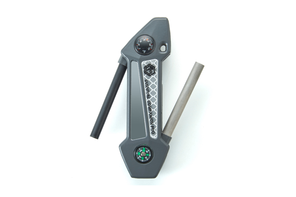 The tough aluminum body is built to take a beating, while you survive the elements. The hand tool contains fold out ferrocerium and magnesium rods for fire starting, along with an emergency whistle, blade sharpener, reflective & mirror panels. The compass and thermometer are also essential to survival out in the elements. The feature rich removable belt clip contains a screwdriver, bottle and can opener, 4 different hex wrenches, a serrated scraper, and a ruler.