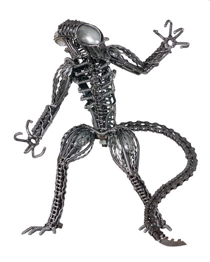 Made from nuts and bolts, link chain and other metal pieces. Since this item is handcrafted, there will be slight variations between each one.