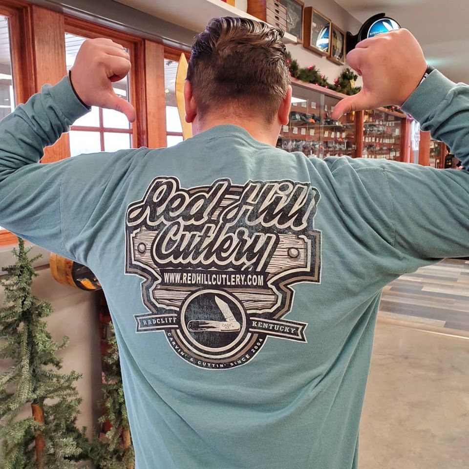 Famous World’s Largest Pocketknife at Red Hill Cutlery centered around a rustic wood sign logo is adorned on this Soft Style Pre-Shrunk 100% Cotton Long Sleeve Shirt. This Beantown Brand shirt provides a comfortable, soft tapered fit. Perfect souvenir from the Knife Capital of Kentucky, Radcliff!!