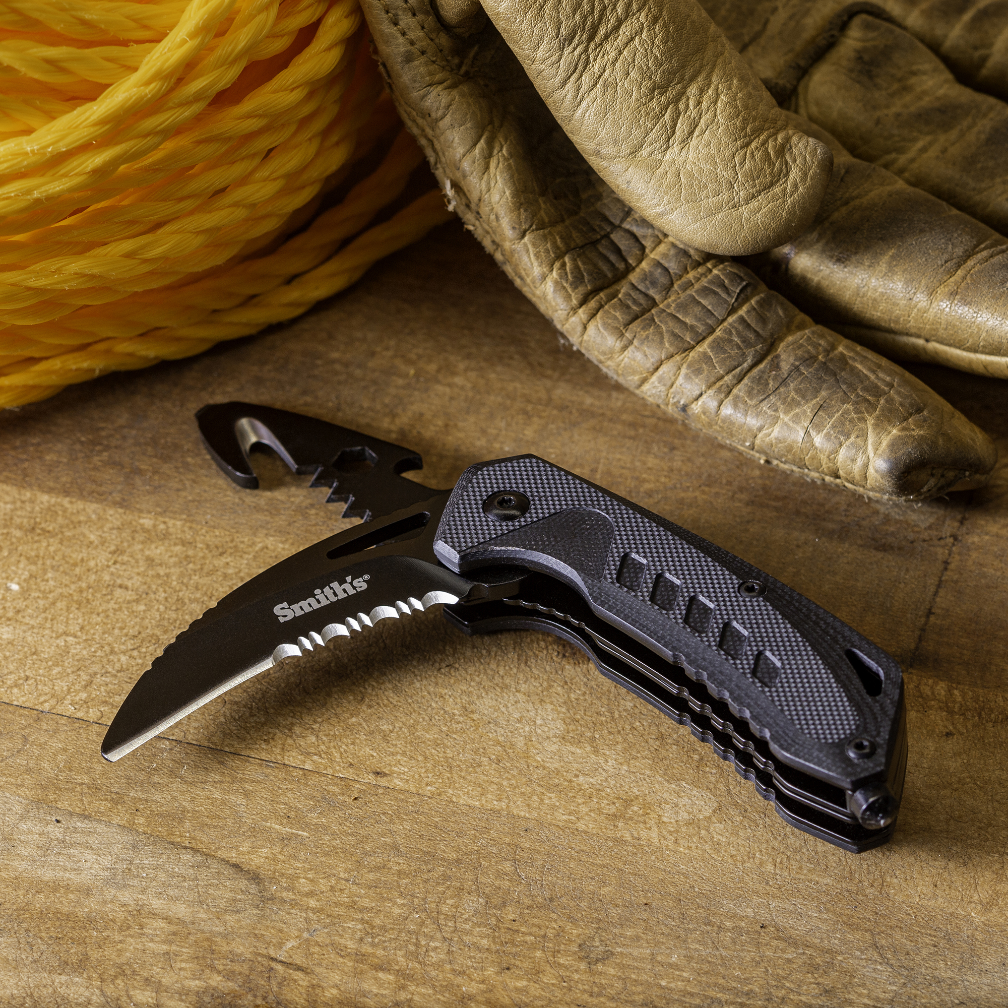 Smith’s Rescue multi-blade knife features primary quick access curved blunt tip blade with over half of the blade with serrations. The primary blade will be secured with a liner lock design for cutting seatbelt webbing or cord removal. The secondary 5-n-1 multi-function blade features a hook-shaped webbing or cord cutter, a hex wrench, a hand saw, a bottle opener, and the blunt tip serves as a flat head screwdriver. The handles are made from rugged G10 material for wet or dry conditions equipped with a tether-ready lanyard hole. The point-up pocket clip keeps the Rescue knife secure in your pocket, tool belt, or emergency pack. The built-in glass breaking tip is constructed from precision ground carbide optimally-place for striking impacts.