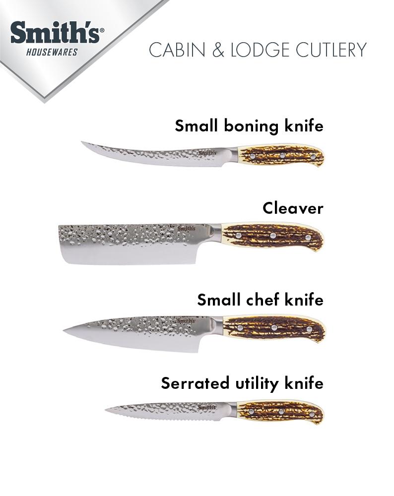 Cabin & Lodge Kitchen Knives from Smith’s feature 420 stainless steel blades with a custom hammered finish and handsome stag handles. These knife sets will satisfy any home-based chef and will provide many years of trouble-free use.