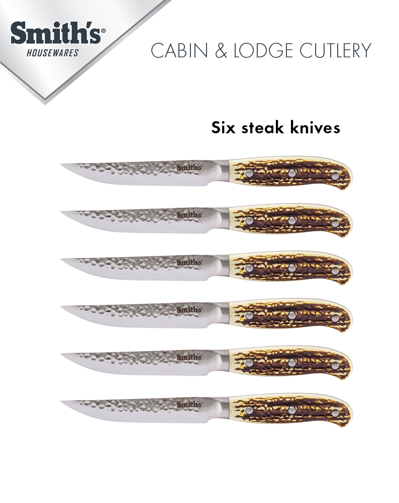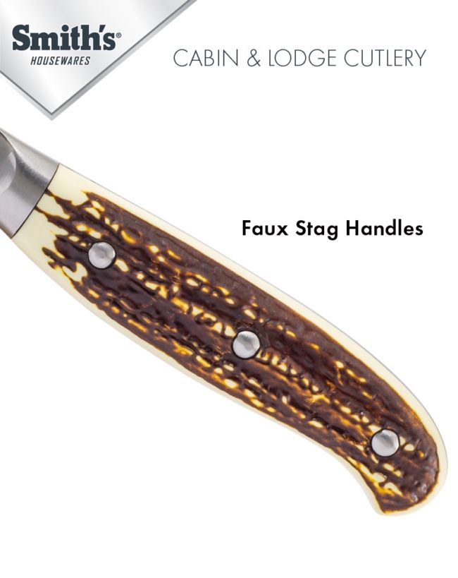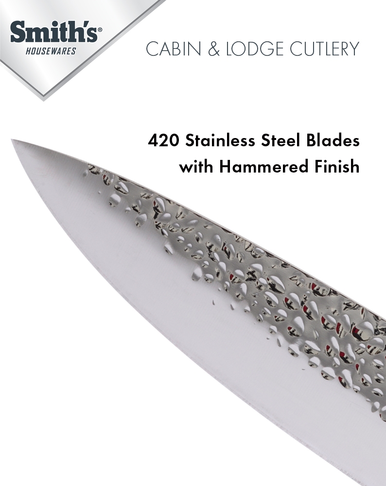 Cabin & Lodge Kitchen Knives from Smith’s feature 420 stainless steel blades with a custom hammered finish and handsome stag handles. These knife sets will satisfy any home-based chef and will provide many years of trouble-free use.