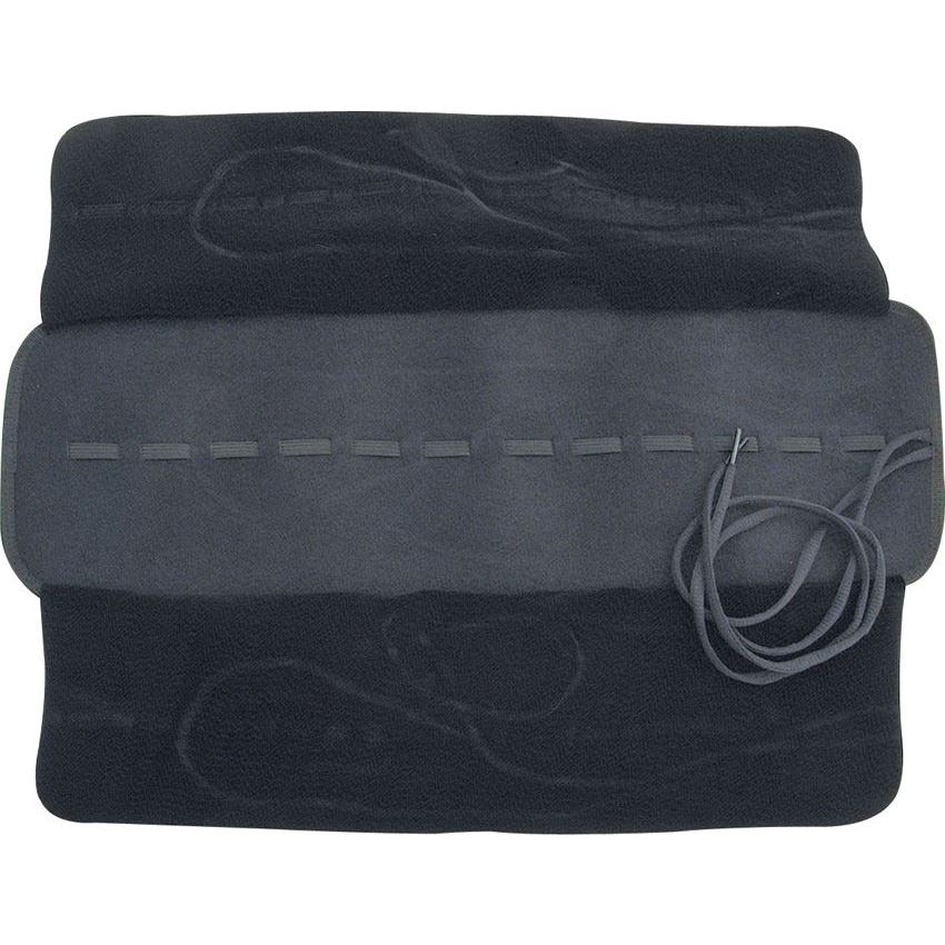 Measures approximately 6.25″ x 6.25″ closed and 6.25 x 17.75″ wide open. Holds approximately 12 knives. Black imitation leather construction with cloth lining. Tie closure. Made in China.