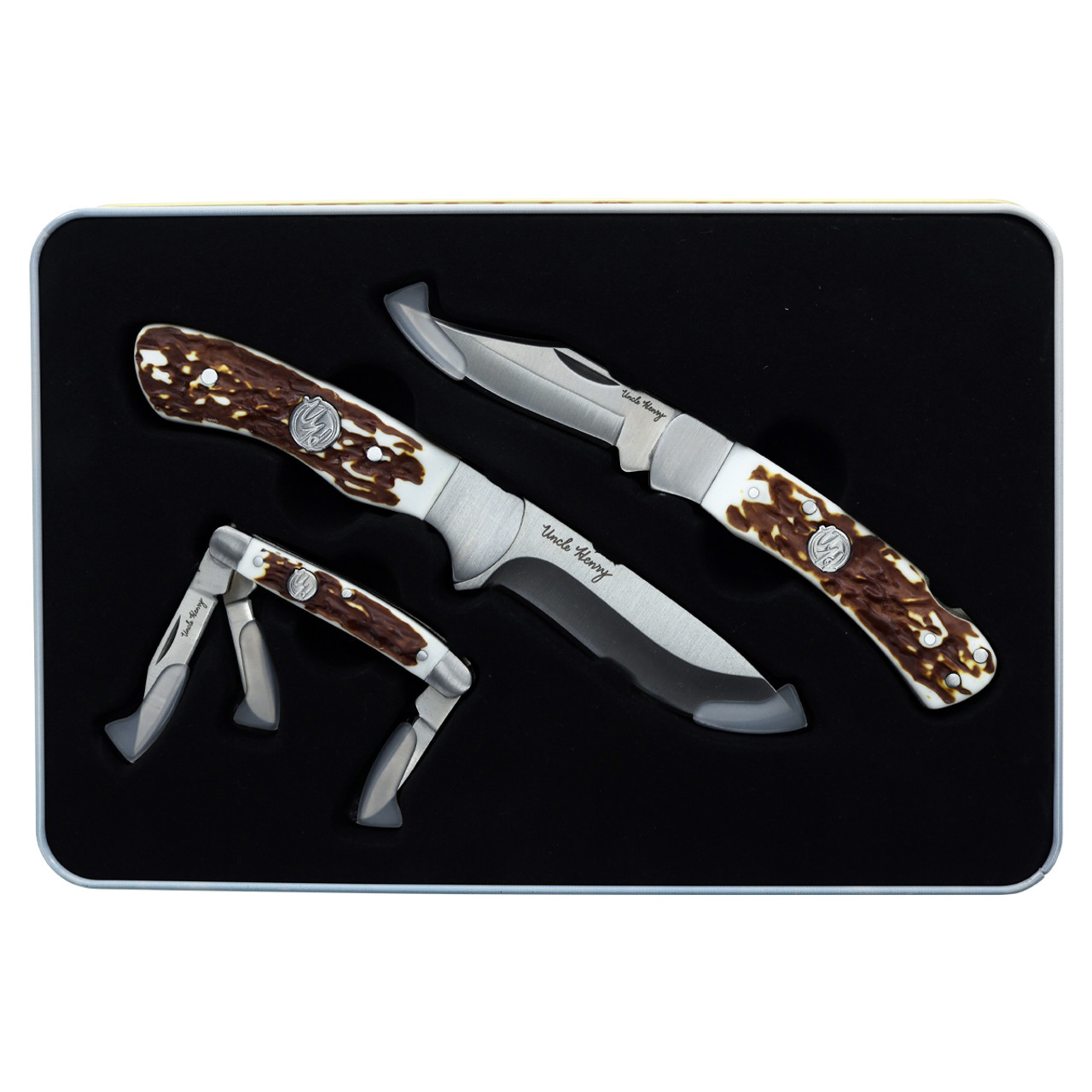 The Uncle Henry Staglon Handle 3-Piece Fixed/Linerlock/Folder Combo offers a versatile set of knives designed to handle a wide range of cutting tasks, from outdoor adventures to everyday use. This set includes two fixed blades and one folding knife, all crafted with stainless steel blades featuring a satin finish for dependable performance and a clean, classic look. Each knife is finished with Uncle Henry’s signature Staglon handles, paired with stainless steel bolsters and an inlaid shield, blending rugged durability with timeless style.