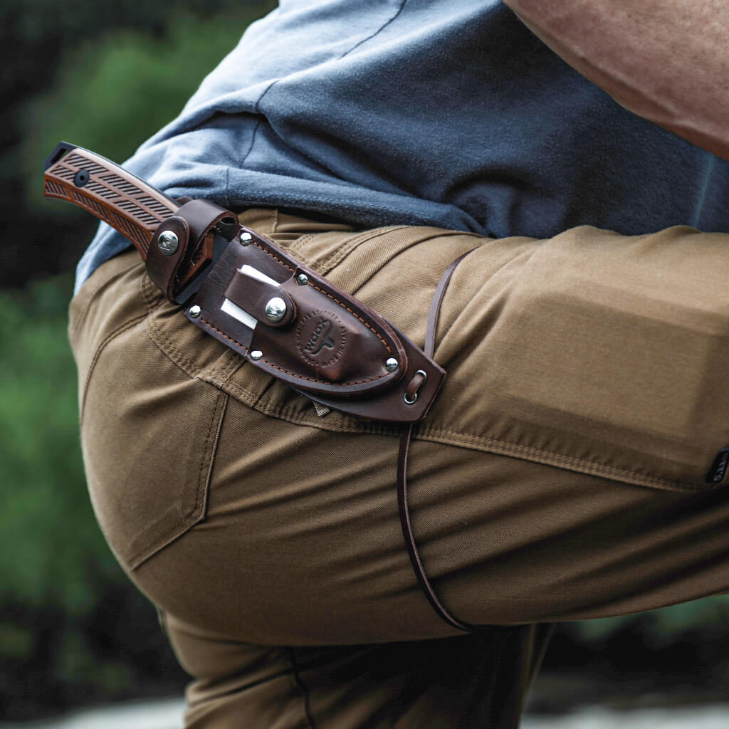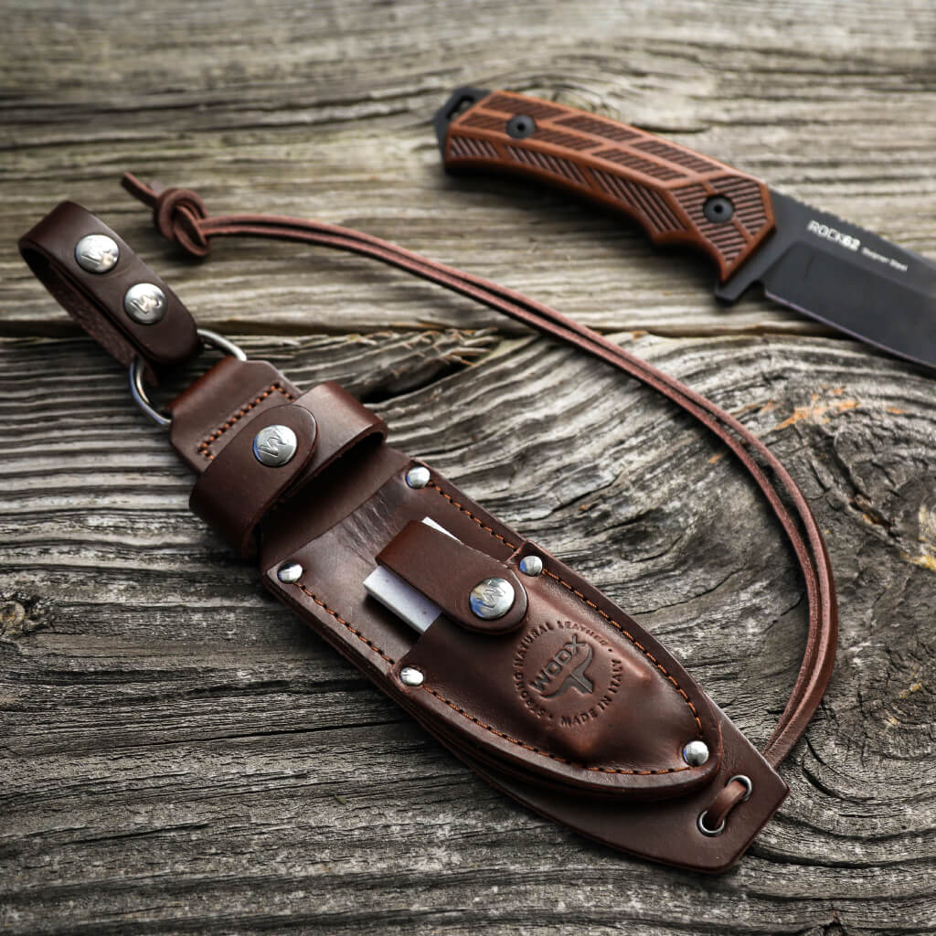 Store your knife in a handmade sheath crafted in Tuscany from genuine Italian leather. Featuring a whetstone pocket, your new sheath will hold its own, buckled to your utility belt or backpack out in the field.