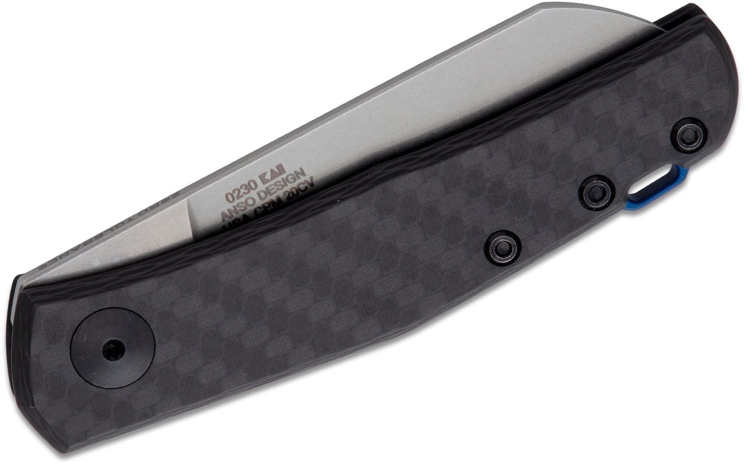 The handle is carbon fiber, making this an exceptionally light and easy carry. The backspacer is anodized in blue and features an integrated lanyard attachment. The knife’s unique features and the clean Anso design make the 0230 a simple, yet extraordinary knife.